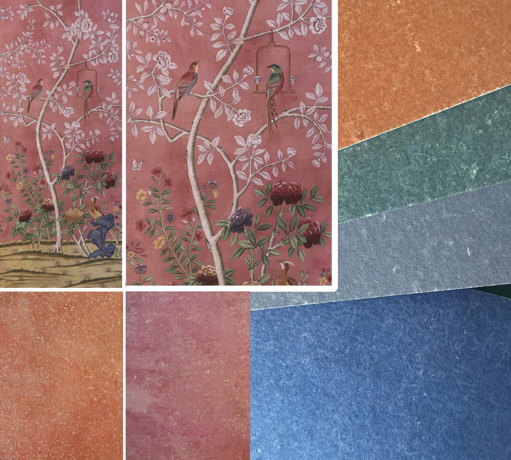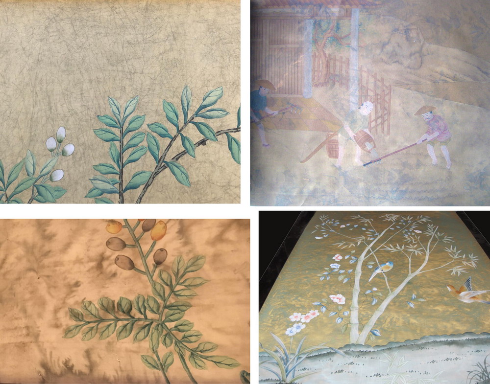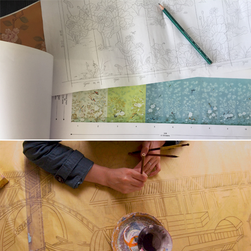 Our handmade wallpapers are devided into European landscape style and Chinoiserie style, can be painted on various background silk materials and metallic wallpaper with unique pattern color usage to fit your room styles.