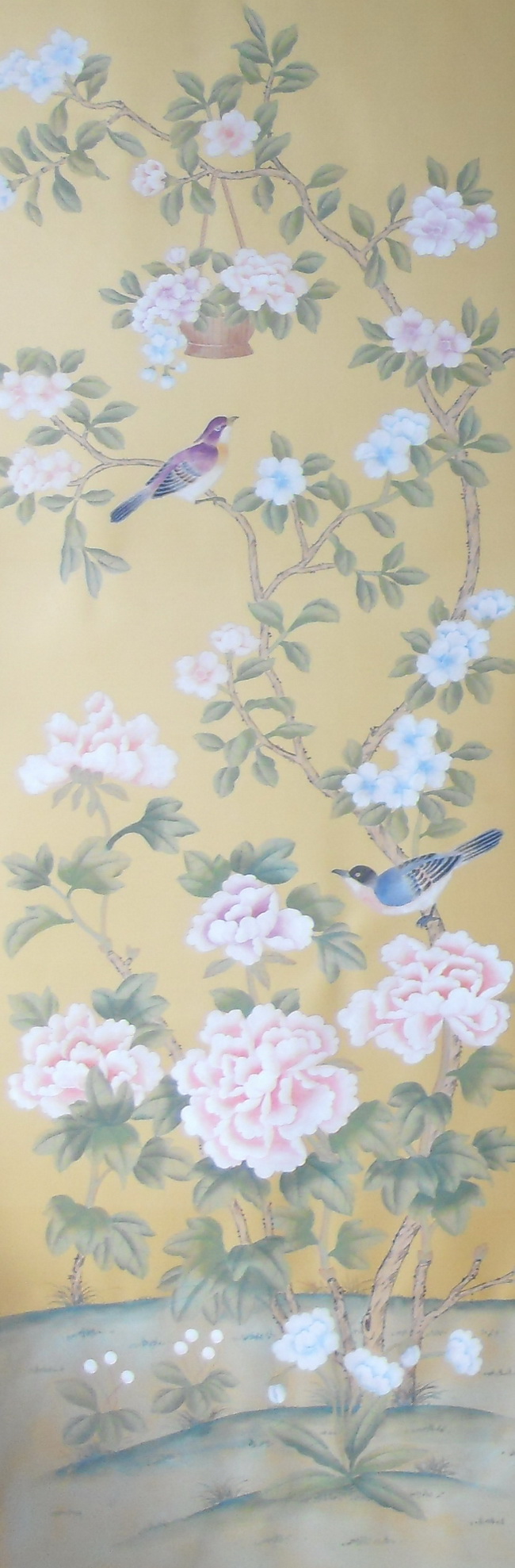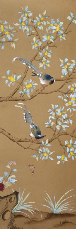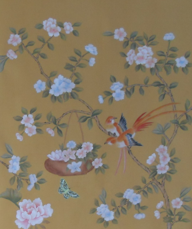 Our handmade wallpapers are devided into European landscape style and Chinoiserie style, can be painted on various background silk materials and metallic wallpaper with unique pattern color usage to fit your room styles.
