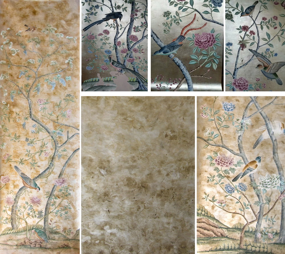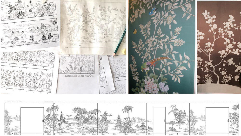 Our handmade wallpapers are devided into European landscape style and Chinoiserie style, can be painted on various background silk materials and metallic wallpaper with unique pattern color usage to fit your room styles.